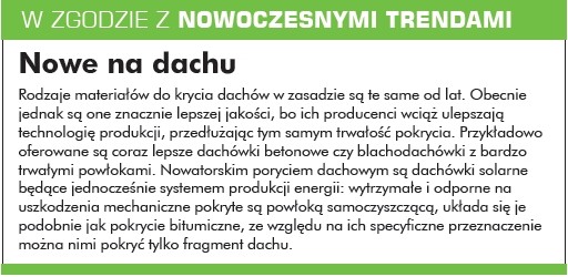 Podążanie za ekologią. Coraz większą wagę przywiązuje się do tego, aby materiały stosowane do konstrukcji dachu i jego pokrycia spełniały kryteria ekologiczności, tzn. możliwość ponownego wykorzystania, trwałość pokrycia, ważne jest również to, by były one wykonane z surowców odnawialnych, a ich energochłonność w procesie powstania była jak najniższa. Ważnym kryterium ekologiczności jest także zdrowie mieszkańców – warunek ten spełniają zarówno chemia użyta do budowy dachu, jak i materiały izolacyjne.