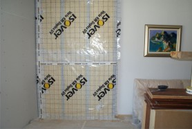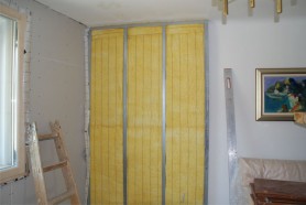 Fot. 5. Izolacja z wełny szklanej na ścianie prostopadłej musi mieć od 60 do 100 cm długości. Podobnie powinny zostać ocieplone podłoga i strop. Jednak czasem rezygnuje się szczególnie z ocieplania podłogi – z powodu chęci ograniczenia zakresu prac remontowych.