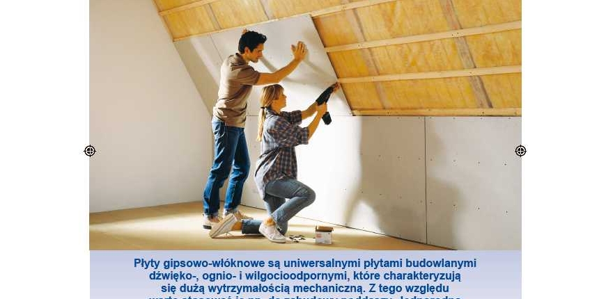 Płyty gipsowo-włóknowe są uniwersalnymi płytami budowlanymi dźwięko-, ognio- i wilgocioodpornymi, które charakteryzują się dużą wytrzymałością mechaniczną. Z tego względu warto stosować je np. do zabudowy poddaszy. Jednorodna struktura materiału i zbrojenie włóknami sprawiają, że płyty są bardzo stabilne i mogą być poddawane dużym obciążeniom występującym przy konstrukcji dachu wykonanej z drewna. Płyty te montuje się w systemie suchej zabudowy.